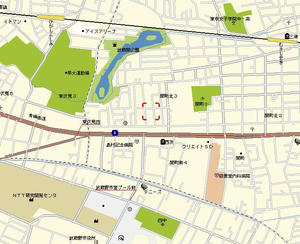 私が調べたところ、グランドは武蔵野私営プール前のバス停のところの角だと思います。