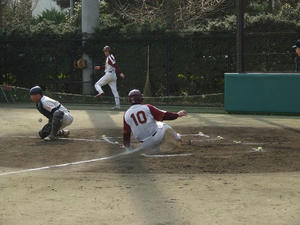 ここでフニャの打球はキャッチャーの送球エラーを誘って、トリがホームイン!