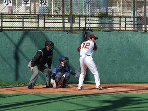 初回、先頭の松ちゃんが幸先よくセンター前へヒットを放つ!