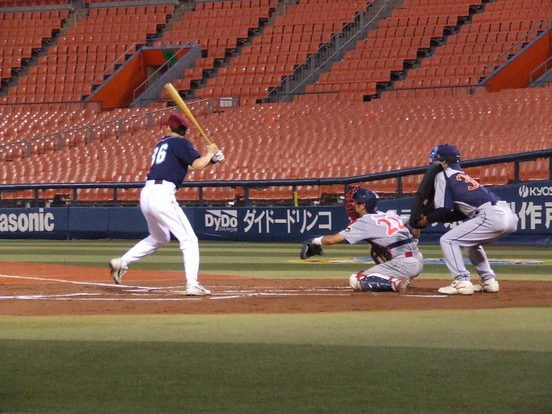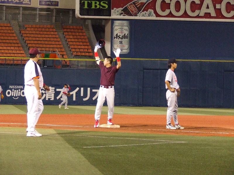タイムリー3ベースを打って、スタンディングオベーションの観客に笑顔で応える金原選手...このあとアウトカウントを間違えて、内野ゴロでホームに突っ込みあえなくアウト...スタンドからは激しいブーイングが!