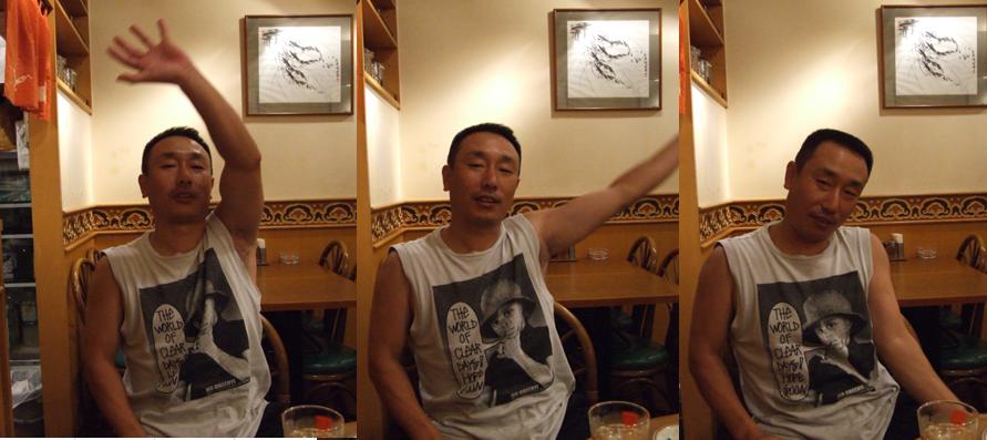 「いいかい、ぐろ~ぶってのはさぁ、こぉ~~やって円をかくよぉ~に出すと...あっ、おねえちゃん、ウ~~ロンハイ2つ..やっぱ3つ.....だからね...ベースはぜったいにぃ~あけちゃぁ~だめなんだよね~~ん?最終電車何時??」