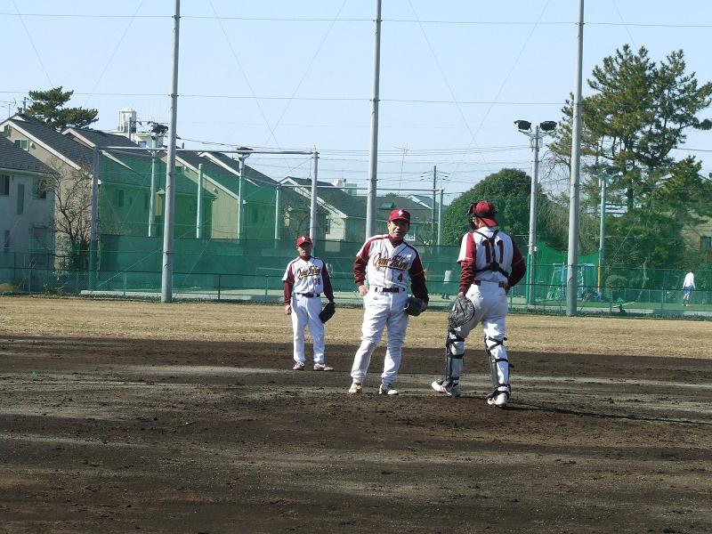 若干霜が残る中、事務所の人たちが整備をしてくれて、いざ試合開始!